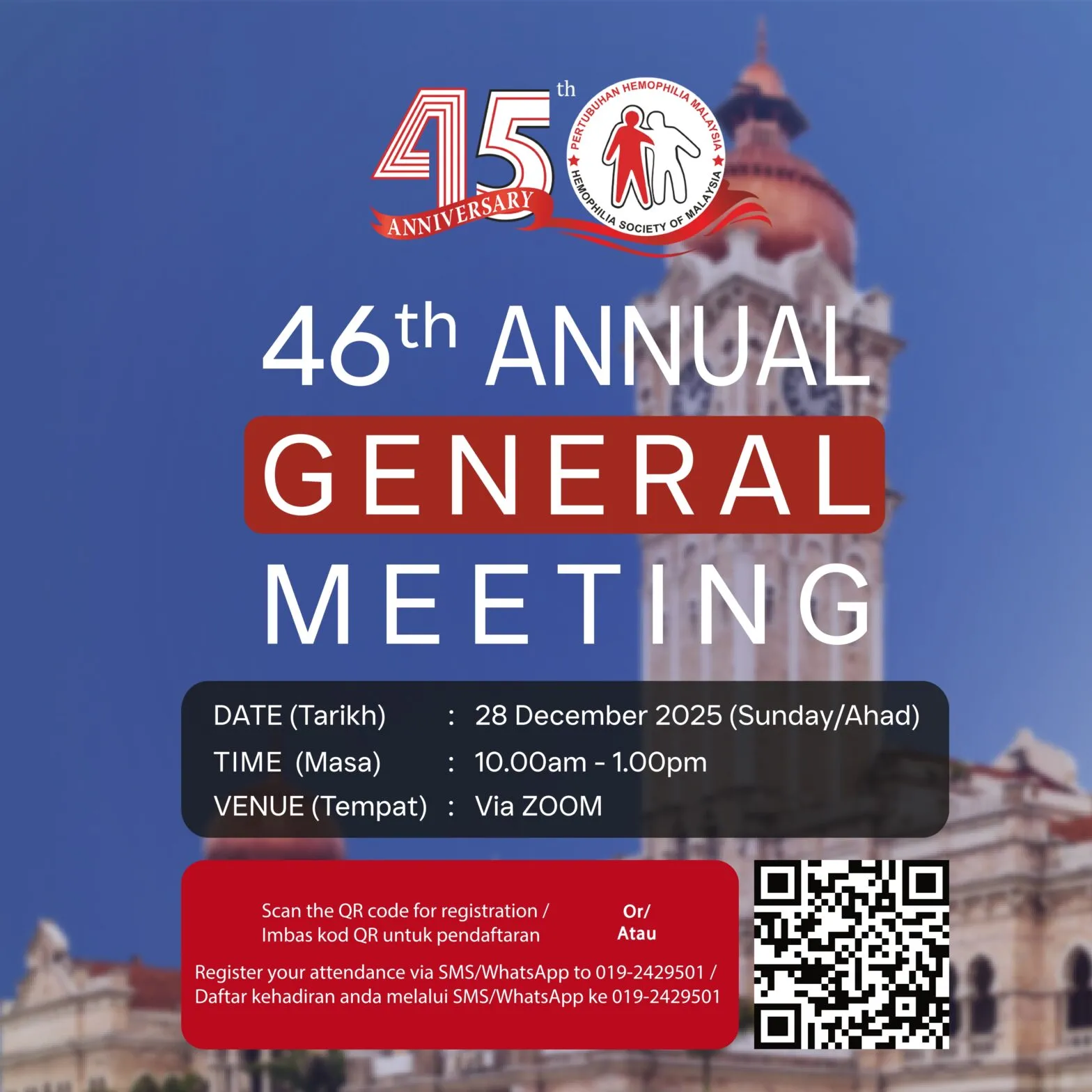 Adalah dimaklumkan bahawa Pertubuhan Hemofilia Malaysia akan mengadakan Mesyuarat Agung Tahunan yang ke-46 seperti butiran berikut :- Please be informed that Hemophilia Society of Malaysia will be holding its 46th Annual General Meeting as per below details: Tarikh (Date): 28 Disember 2025 (Ahad / Sunday)Masa (Time): 10.00 pagi – 1.00 petangTempat (Venue): Zoom Agenda Mesyuarat …
